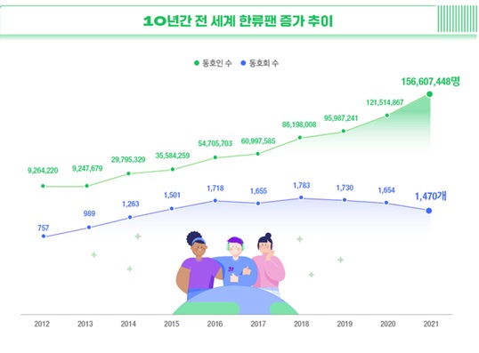 3일 KF(Korea Foundation·한국국제교류재단·이사장 이근)가 152개 재외공관과 협력해 발간한 '2021 지구촌 한류현황'에 따르면, 작년 12월 기준 전 세계 한류 팬 수는 1억5660만 명으로 조사됐다.
