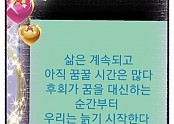 꿈꾸기을 멈추는 순간부터 .. 인기글 꿈꾸기를 멈추는 순간부터... 만약 꿈꾸기를 멈추고 더 이상 원하는 것이 없이 편안함을 느낀다면, 더 이상 자라지 않는다는 뜻입니다.사람이 나이가 들어 꿈꾸기를 멈추는 것이 아닙니다. 꿈꾸기를 멈추는 순간부터 나이가 드는 겁니다. 그러니 끊임없이 꿈에 투자하십시오. 꿈은 나이가 없습니다. 사람에게는 나이가 있지만 꿈은 영원합니다. 우리가 꿈꾸기를 멈추는 순간부터 나이가 드는 겁니다.그러니 여러분도 끊임없이 꿈을 꾸시고, 꿈에 투자하십시오.꿈은 죽지 않습니다. (2009-09-23 03:00:32)
