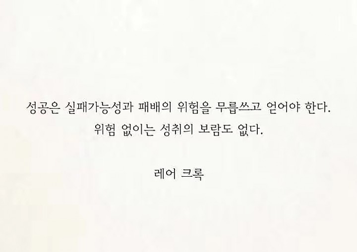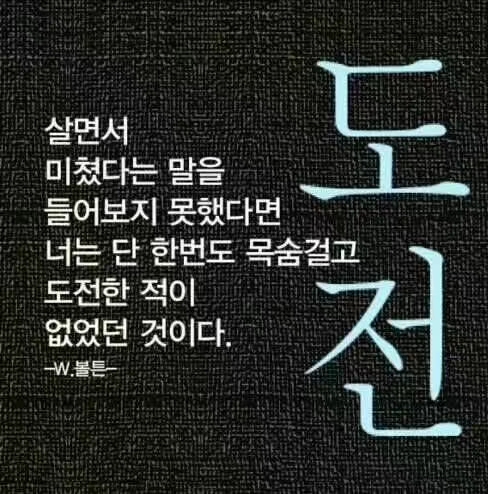 새로운 도전없이 새로운 인생도 없다 인기글 한 사람은 다르다. 최선을 다하되 생각이 달라야 한다. 한계점에 도달했다고 생각할 때 한번 더 시도한다. 자신에겐 인색하고 남에겐 너그러워야 한다. 임재연-우주 천인그룹 대표이사 겸, 세계경제 조절 위원회 회장영원한 패자도 승자도 없는 승부의 세계. 맞수는 발전의 원동력. 마음을 비워야 다시 일어난다.조훈현-세계 바둑계의 황제남과 같이 해선 남 이상 될 수 없다. 구자경- LG그룹 명예회장더 높이 꿈꾸며 더 멀리 내다보고 더 빨리 움직이자 차선도 최선이 될 수 있다. 준비는 소리 없이 결정은 …(2011-06-25 08:44:26)