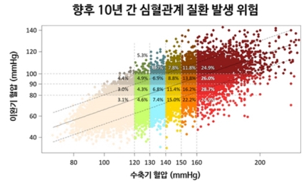 연구팀이 향후 10년 간의 심혈관계 질환 발생 위험도를 예측해보니 수축기 혈압이 높아질수록 심혈관계 질환 발생 위험도 비례해서 커졌다. 또 수축기 혈압이 같다면 이완기 혈압이 낮을수록 위험도가 증가하는 경우가 많았다. 이는 성별·연령에 따라 수축기·이완기 혈압이 심혈관 질환을 일으키는 영향이 달라지기 때문인 것으로 분석됐다.