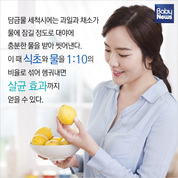 6. 담금물 세척시에는 과일과 채소가 물에 잠길 정도로 대야에 충분한 물을 받아 씻어낸다. 이 때 식초와 물을 1:10의 비율로 섞어 헹궈내면 살균 효과까지 얻을 수 있다.
