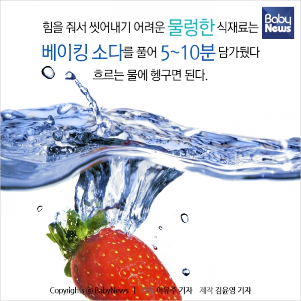 딸기는 농약 사용을 많이 하는 과일 중 하나다. 조금만 힘을 줘도 잘 무르고, 특유의 달달한 향과 맛으로 농약을 많이 친다. 특히 딸기는 잿빛 곰팡이가 피는 경우가 많아 곰팡이 방지제를 뿌려 재배한다. 이처럼 까다롭게 재배된 딸기는 물에 1분 동안 담근 후 흐르는 물에 30초 정도 씻어준다. 껍질을 벗기지 않고 통째로 먹는 과일이니 흐르는 물에 3~4번 이상 꼼꼼하게 씻는다. 특히 꼭지 부분은 농약이나 벌레 등 이물질이 많이 달라붙어 있으므로 미리 떼고 먹는 것을 추천한다.