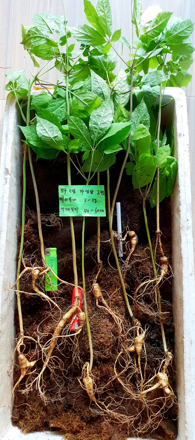 1대 야생산삼 씨를 심은 후 자연방임상태에서 야생으로 자란 덕분에 이렇게 5구 삼으로 자랐습니다