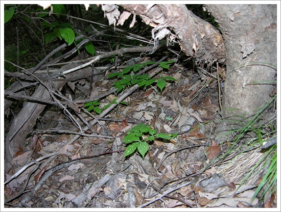 산삼의 최초의 싹(3행) 인위적 개갑과정을 거치지 않고 발아된 싹은 3엽으로 나오며 씨가 땅에 떨어져 자연발아까지는 약 3년정도 걸린다. 이때는 딸의 외피가 뿌리에 붙어있다. 인삼은 인위적 개갑을 통하여 그 이듬해에 싹을 틔운다.5행 (5엽) …(2018-05-08 18:21:48)